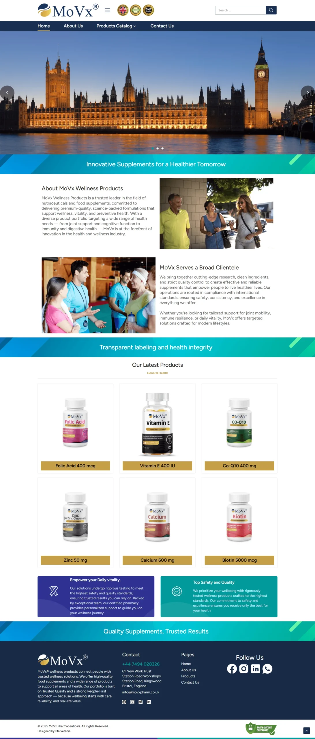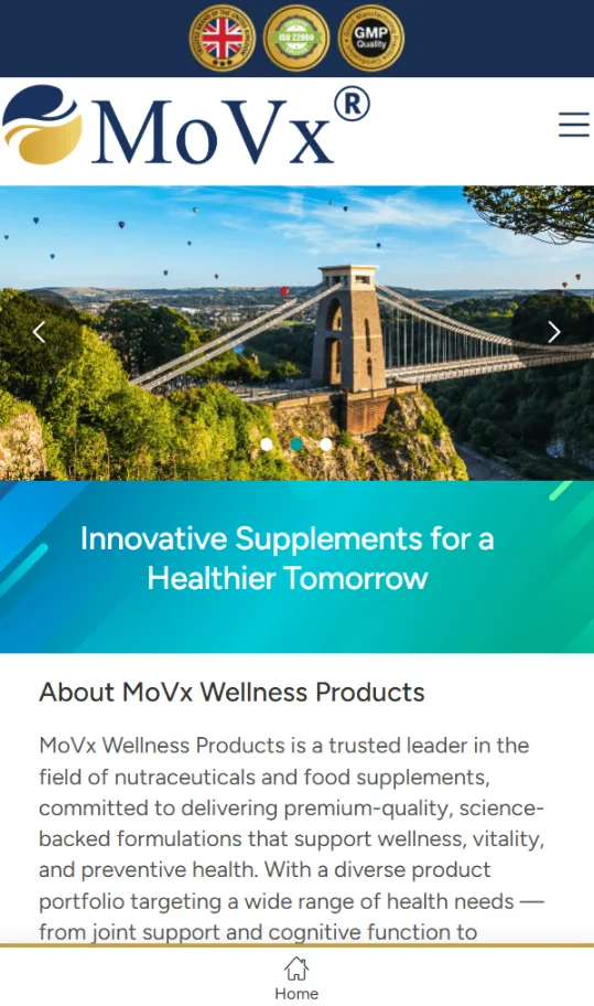 MoVx Wellness Products website, a modern platform showcasing premium nutraceuticals and health supplements. The site includes organized product categories, detailed catalog pages, and a clean, user-friendly layout focused on wellness education. With smooth navigation, responsive design, and a professional brand presence, it helps users explore high-quality supplements, learn health benefits, and easily connect with the company for guidance and support.
