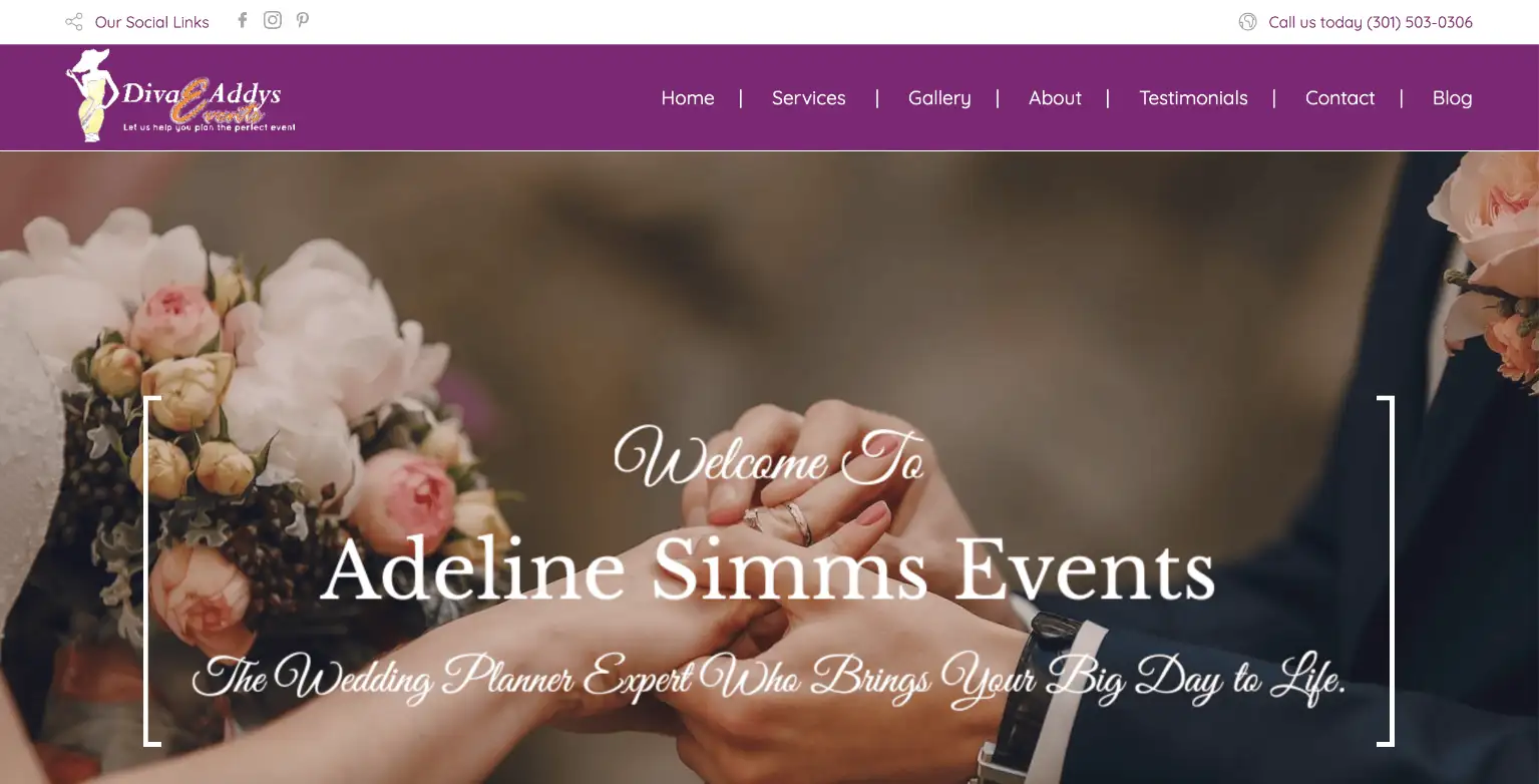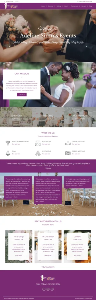 Adeline Simms Events website, a professional platform for wedding and event planning services in the DMV area. The site highlights ceremony planning, vendor management, invitations, design styling, and honeymoon destinations. Featuring testimonials, galleries, blogs, and contact sections, the responsive design delivers an elegant, organized, and stress-free user experience tailored for couples planning memorable events.