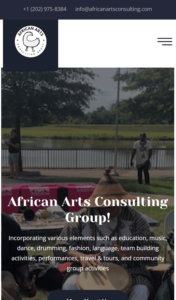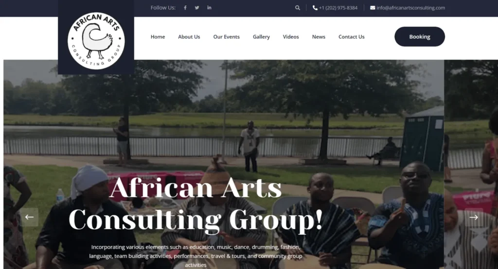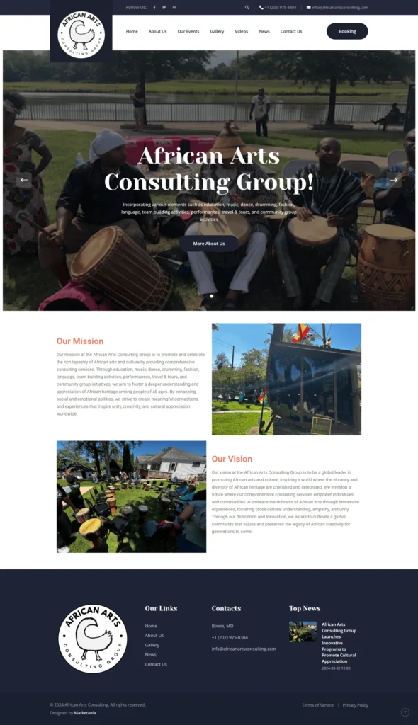African Arts Consulting Group website, a cultural platform promoting African arts and heritage worldwide. The site presents consulting services including education, music, dance, drumming, fashion, travel, and community programs. Featuring events, galleries, videos, news, and booking options, the responsive design delivers an engaging, informative, and culturally rich user experience focused on connection, creativity, and global appreciation.