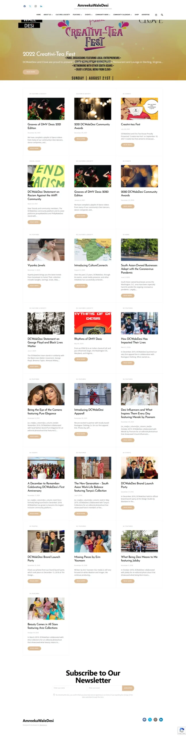 AmreekaWaleDesi website, a community platform for South Asians living in the United States. The site features community news, cultural stories, events, blogs, calendars, business promotions, and newsletters. With structured content categories, clean navigation, and a responsive layout, the website connects users through culture, society, events, and shared community experiences.
