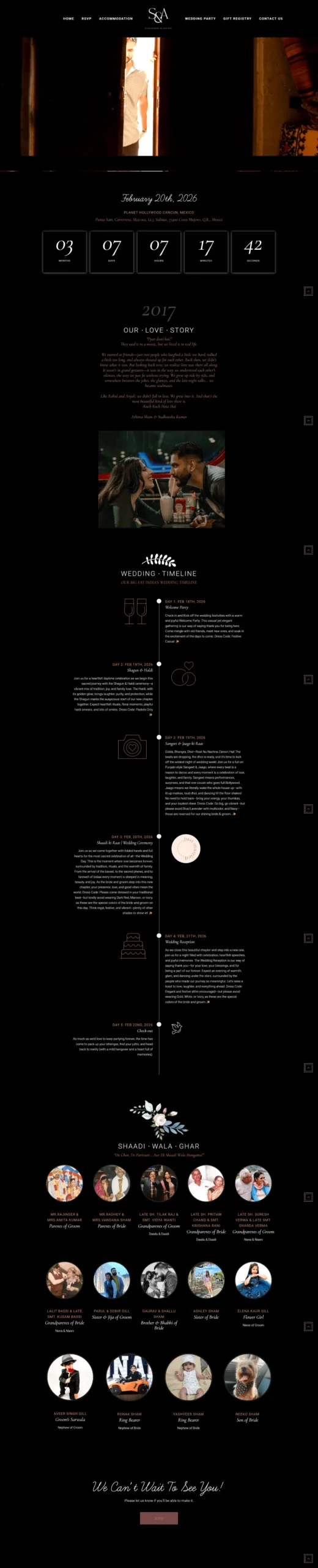 Ashima and Sudhanshu’s wedding website is a personalized digital experience created to celebrate their destination wedding in Cancun, Mexico. The website includes event timelines, RSVP functionality, accommodation details, wedding party information, a countdown timer, the couple’s love story, and venue details. Designed with elegant visuals, smooth navigation, and full mobile responsiveness, it offers an immersive and joyful experience for guests attending a multi-day Indian wedding celebration.