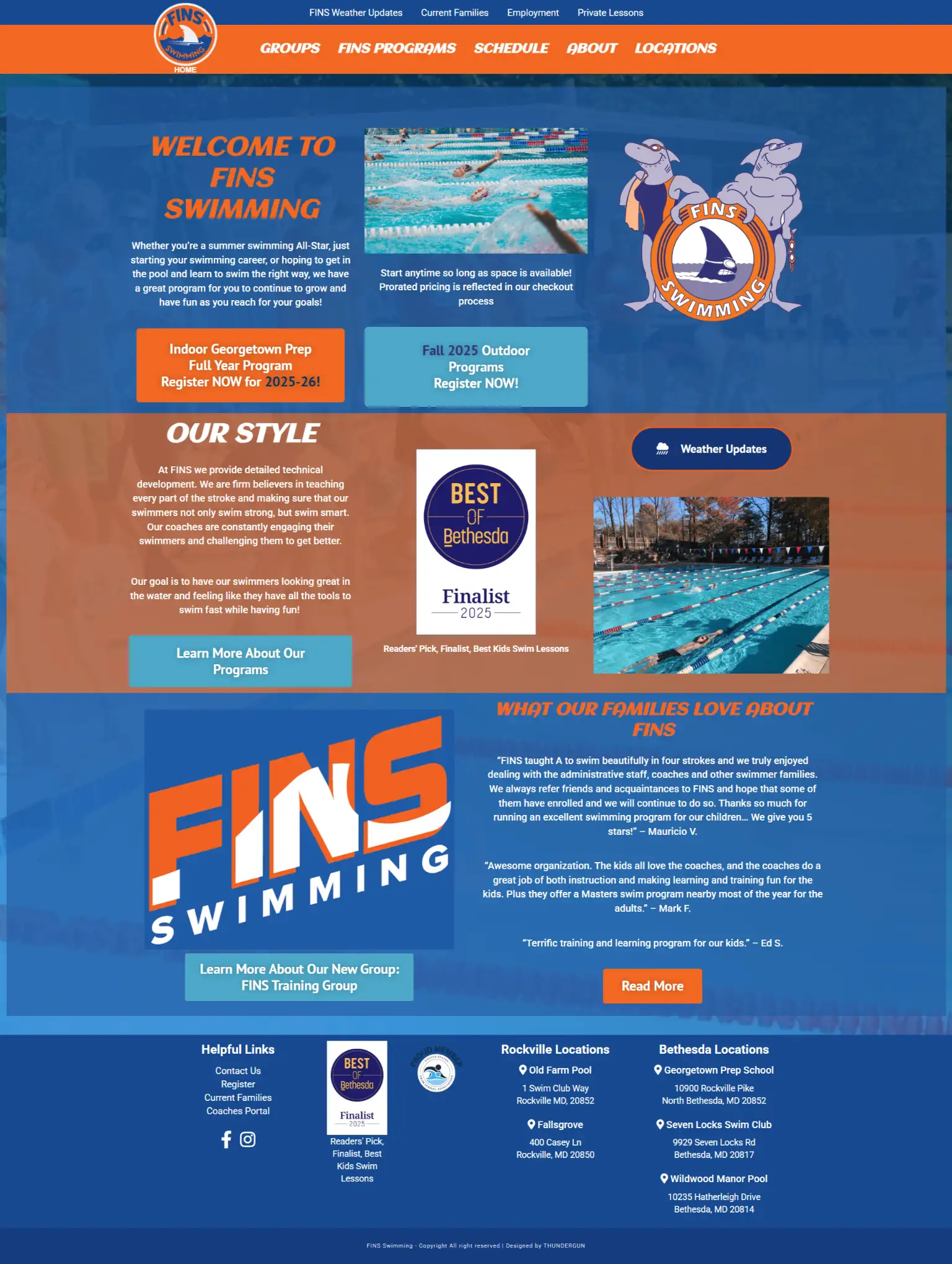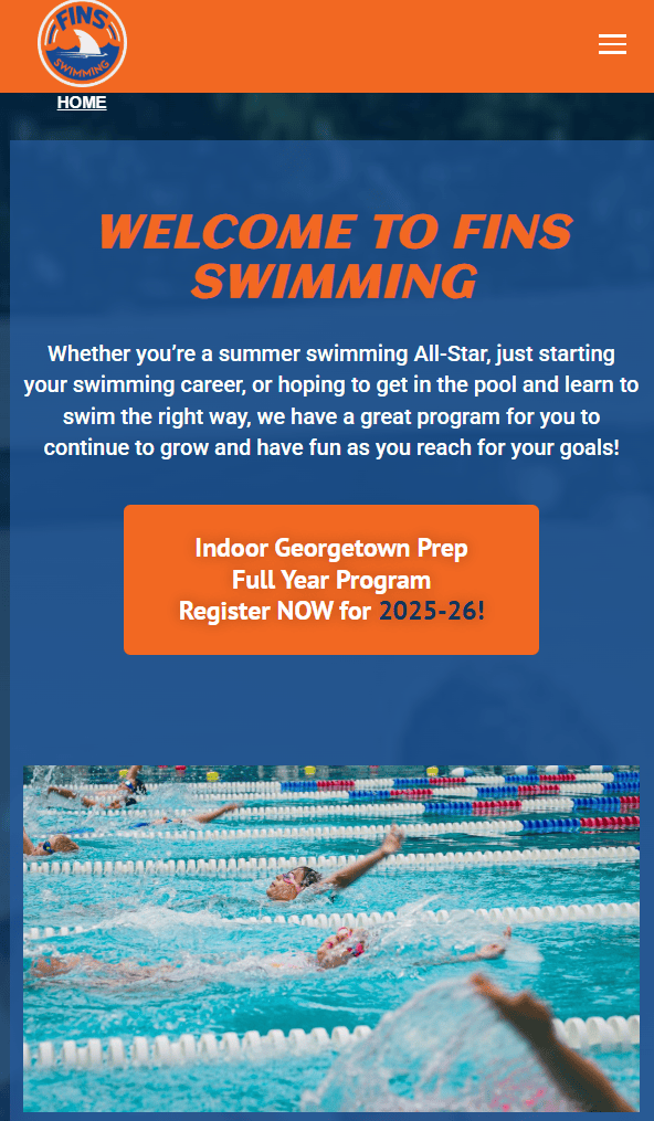 FINS Swimming website to clearly showcase programs, locations, and seasonal registrations for families and athletes. The site emphasizes technical training philosophy, easy navigation, and strong calls to action for enrollment. With responsive design, schedule visibility, and weather updates, it delivers a seamless experience for parents, swimmers, and staff across all devices.