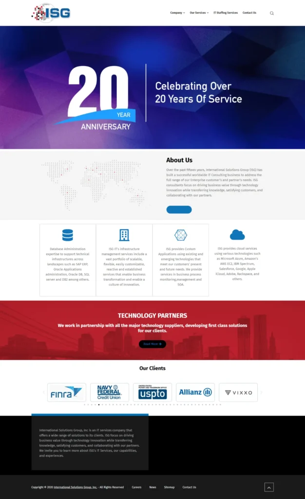 International Solutions Group (ISG) website, showcasing their IT consulting, staffing, and infrastructure management services. The site features detailed service descriptions, technology partnerships, client portfolios, and expertise across databases, cloud solutions, and custom applications. With a clean, responsive design and intuitive navigation, the website provides a professional, user-friendly platform highlighting ISG’s global IT capabilities and business innovation.