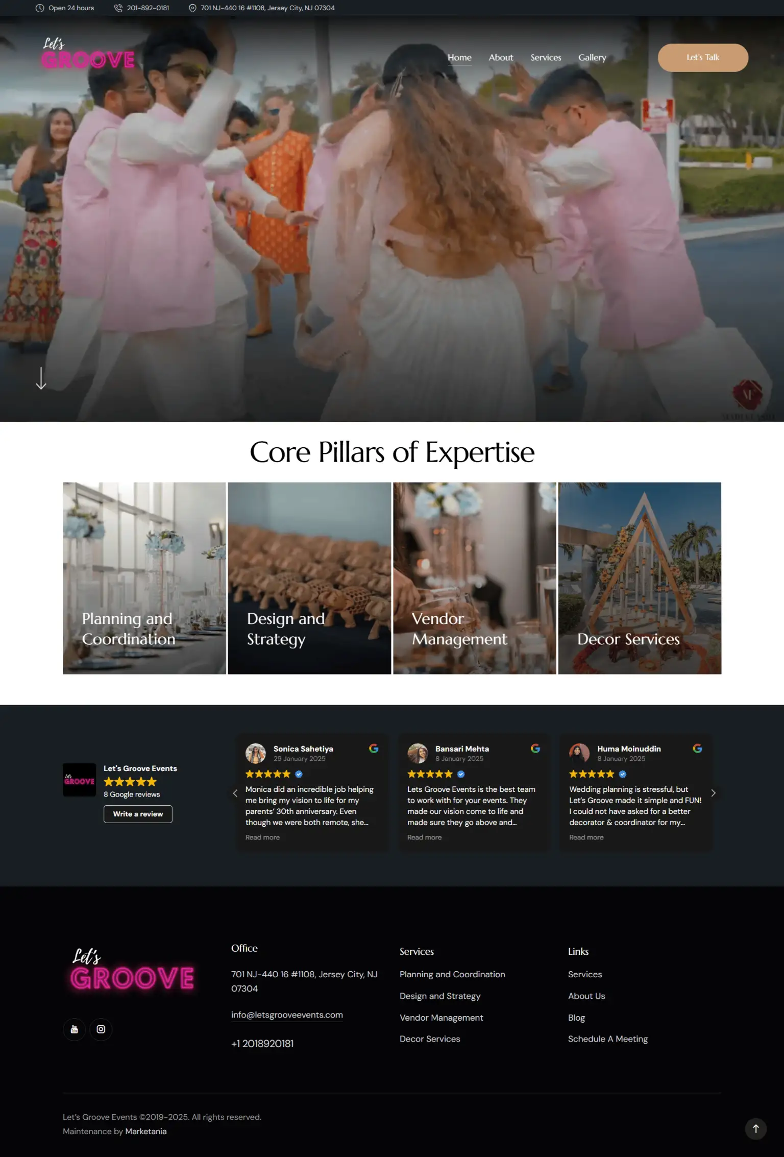 Let’s Groove Events website, highlighting professional event planning and décor services in Jersey City, NJ. The site features service listings, gallery showcase, client testimonials, and a contact portal. Responsive design ensures seamless browsing across devices, making it easy for clients to explore planning, coordination, and vendor management services while reflecting the brand’s vibrant and creative identity.