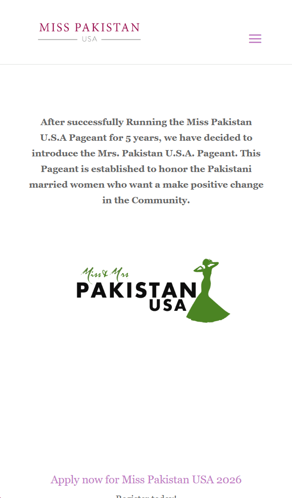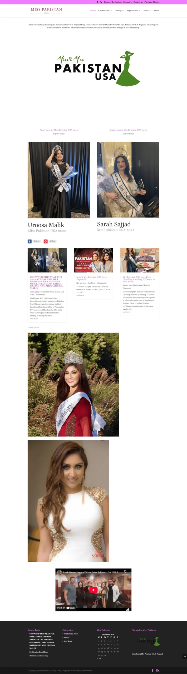 Miss Pakistan USA website, showcasing pageants for both Miss and Mrs. categories. The site features contestant profiles, event galleries, news updates, registration forms, and sponsor information. With an elegant, responsive design and intuitive navigation, the platform highlights cultural pride, community involvement, and annual events, providing visitors and participants a seamless and engaging experience across desktop and mobile devices.