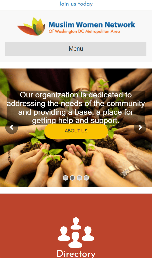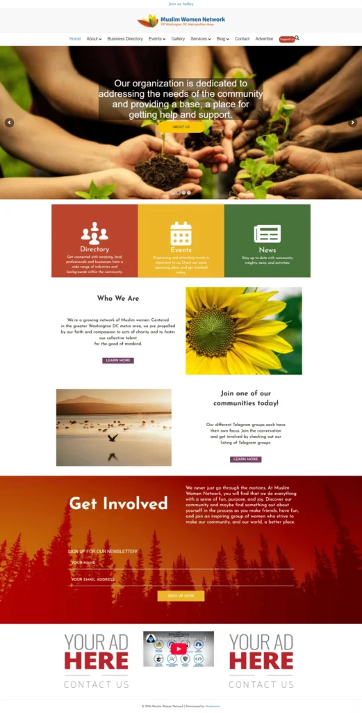 Muslim Women Network website, a community platform connecting Muslim women in the greater Washington DC area. The site features business directories, events, galleries, services like matrimonial support, blogs, and newsletter subscriptions. With a clean, responsive design and intuitive navigation, the website fosters engagement, community connection, and opportunities for collaboration, charity, and empowerment among members.