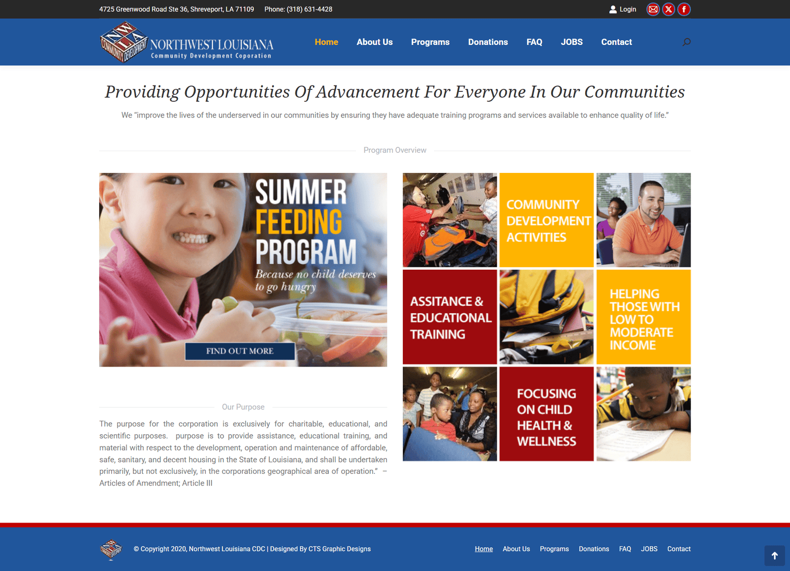 Northwest Louisiana CDC website to promote community advancement and charitable programs. The platform highlights organizational purpose, available training programs, housing initiatives, and donation opportunities. Built with responsive design and clear navigation, it enables visitors to learn about programs, apply for services, and contribute to community development, enhancing engagement and support for underserved populations across Louisiana.