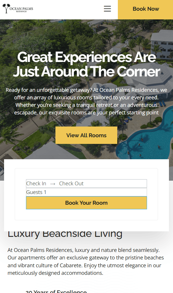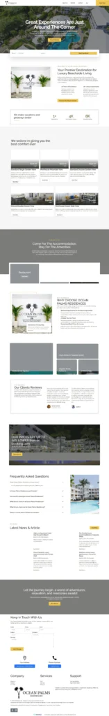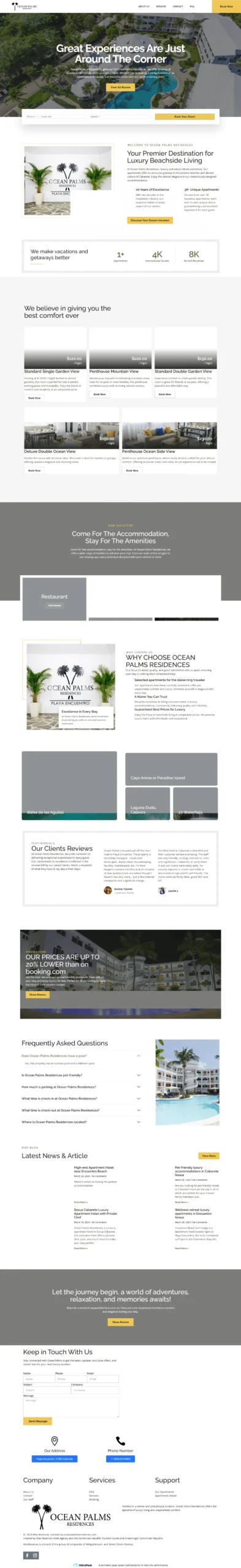 Ocean Palms Residences website to showcase luxury beachfront apartments in Cabarete. The site highlights over 38 unique apartments, amenities, guest services, and local attractions. Features include detailed apartment listings, booking integration, FAQ, and a blog to engage visitors. The design emphasizes elegance, ease of navigation, and responsive layouts for seamless experiences on all devices.