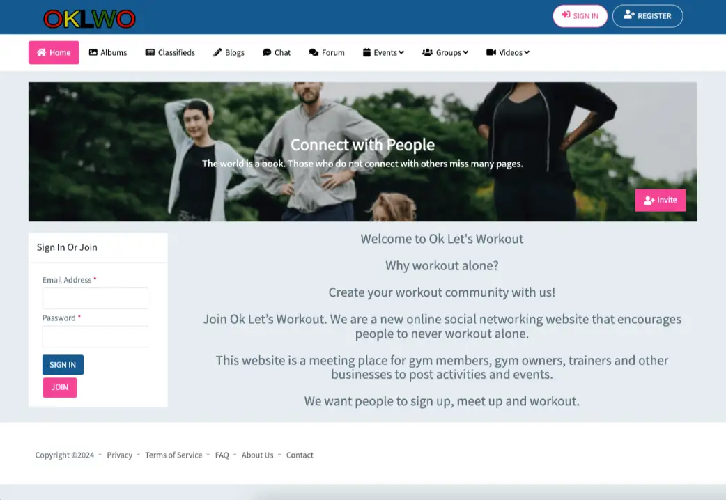 OKLWO website, a social platform connecting fitness enthusiasts, trainers, and gyms. The site allows users to create profiles, join groups, post events, and share workout experiences. With features like blogs, forums, classifieds, and chat, the platform encourages community engagement and ensures no one works out alone. The design emphasizes interactivity, user engagement, and mobile responsiveness.