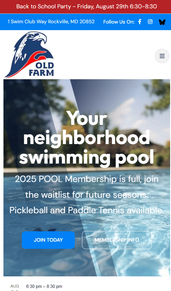 Old Farm Swim and Paddle Tennis Club website, providing a streamlined portal for members and prospective members. Features include membership signup, team information, activity schedules, pavilion bookings, payments, and merchandise. The site integrates sponsor highlights, news updates, and email subscriptions, ensuring an engaging experience that strengthens community connections and promotes club events.