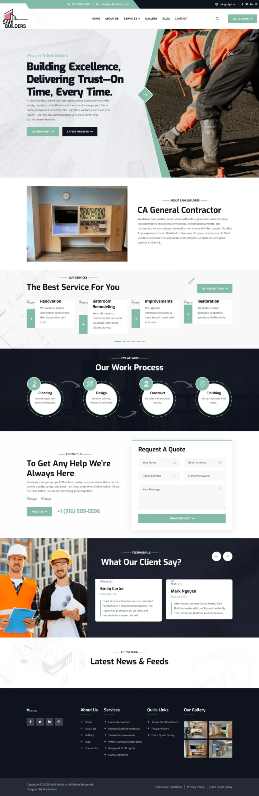 Sahl Builders website, a professional platform for a California general contractor. The site highlights services including renovations, remodeling, tenant improvements, restoration, and design-build projects. With detailed service pages, gallery showcases, blog updates, and contact forms, the responsive and intuitive design ensures clients can explore offerings, request quotes, and connect with the company seamlessly for trusted construction solutions.