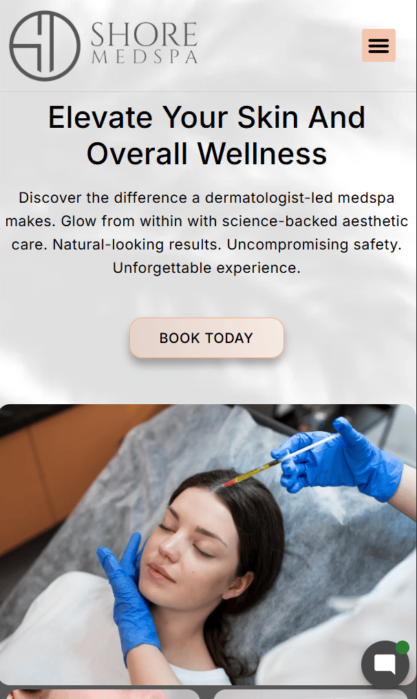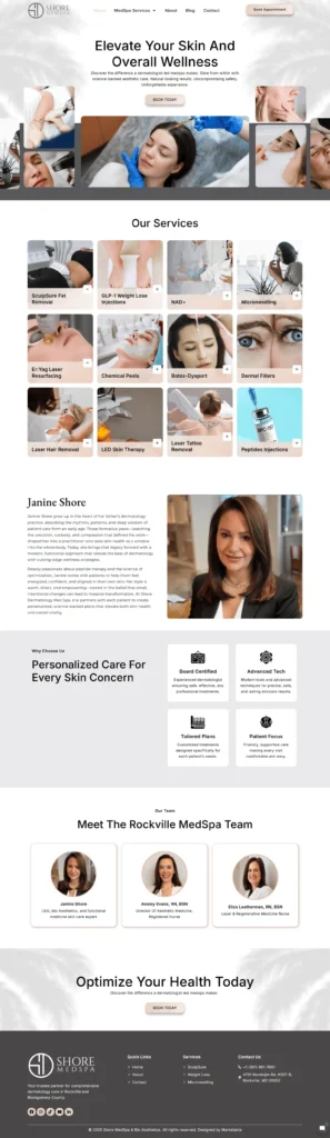 Shore MedSpa’s website, showcasing dermatologist-led services like SculpSure, peptide injections, RF Microneedling, Botox, dermal fillers, and weight-loss programs. The site features service descriptions, expert bios, patient testimonials, blog articles, and appointment booking. A clean, responsive design ensures intuitive navigation, optimized user experience, and highlights advanced, science-backed aesthetic care for patients in Rockville and Montgomery County.
