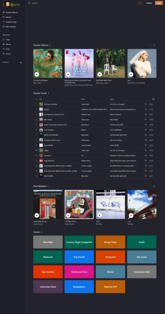 Sogania website, a dynamic music platform for discovering albums, playlists, and artists. The site features search functionality, genre filters, and personalized song histories, offering an intuitive, responsive interface. Users can browse new releases, popular tracks, and curated playlists, ensuring an immersive and engaging experience for music lovers while maintaining a sleek, modern aesthetic.