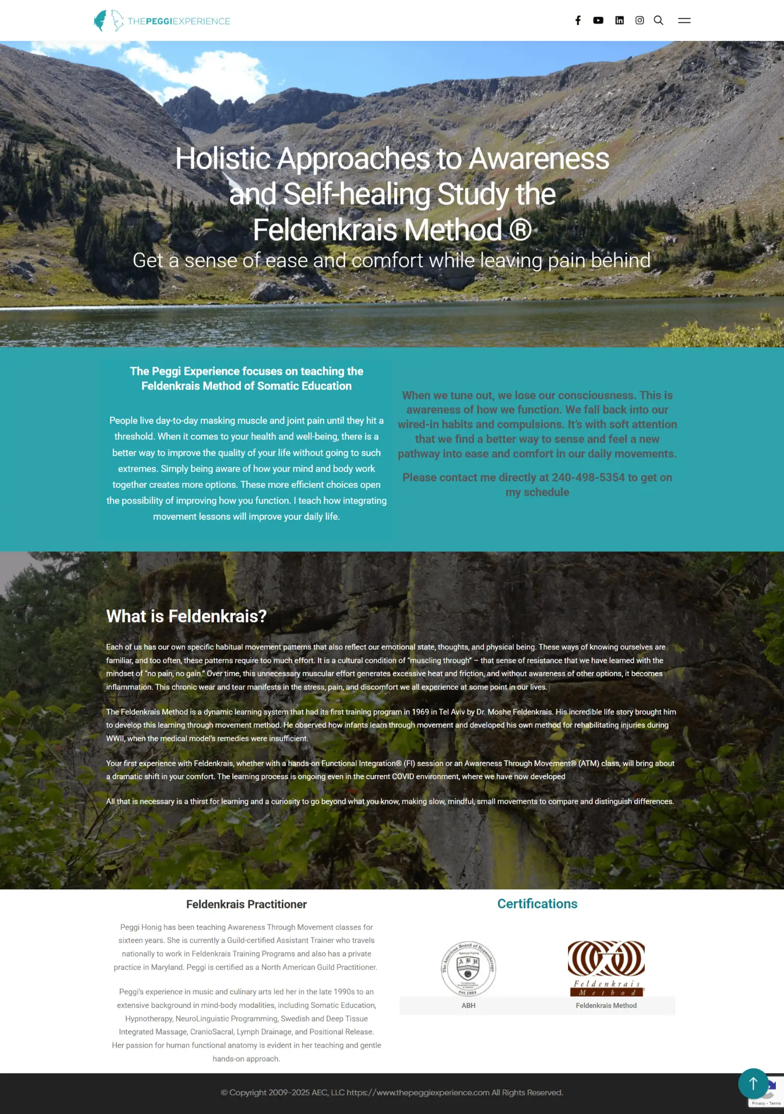 The Peggi Experience website to showcase Feldenkrais Method classes and private sessions led by Peggi Honig in Maryland. The site highlights Awareness Through Movement® and Functional Integration® offerings, certifications, and practitioner experience. With intuitive navigation, it provides class schedules, media resources, and contact information, creating an engaging, informative platform for visitors seeking gentle, mindful approaches to movement, health, and well-being.