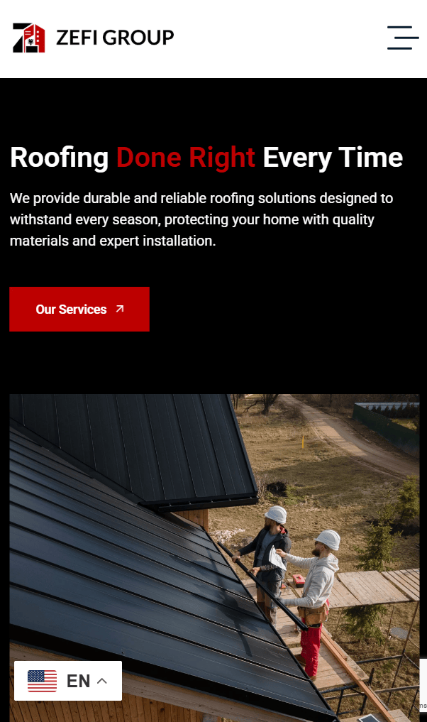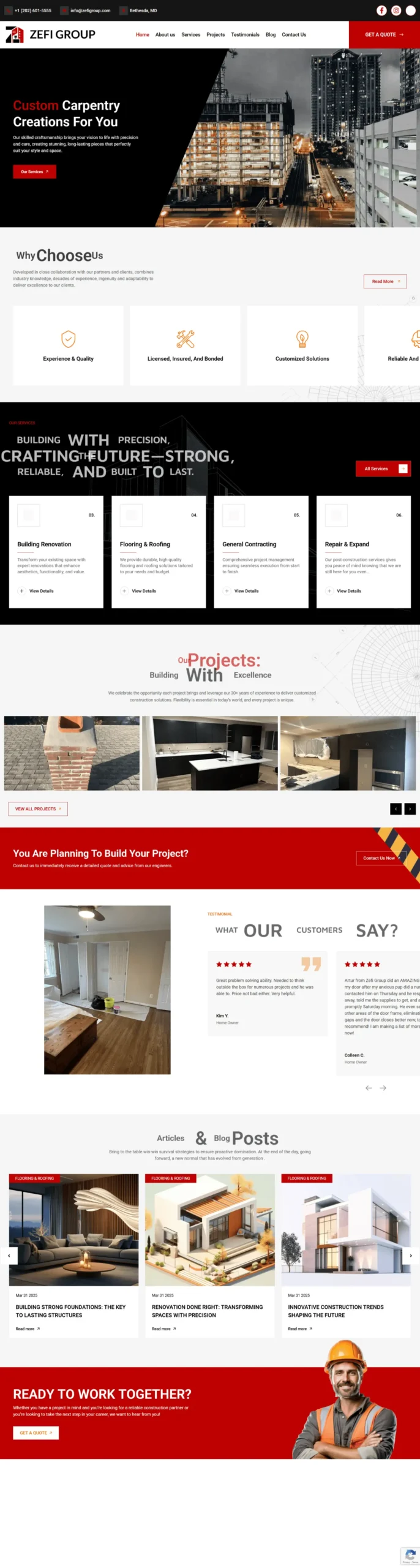 Zefi Group website, a professional construction and renovation services platform. The site highlights services like architecture design, flooring, roofing, general contracting, and repair projects. Featuring client testimonials, project showcases, and a contact form for quotes, the responsive, user-friendly design ensures seamless navigation, engaging visuals, and clear information. It effectively connects potential clients with expert construction solutions.
